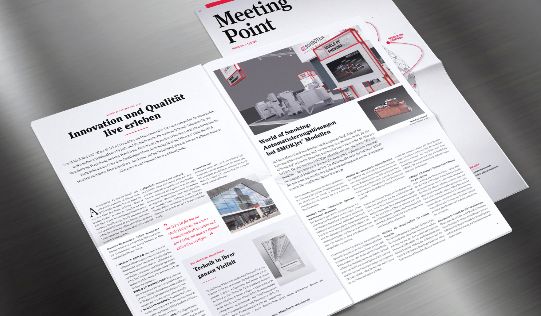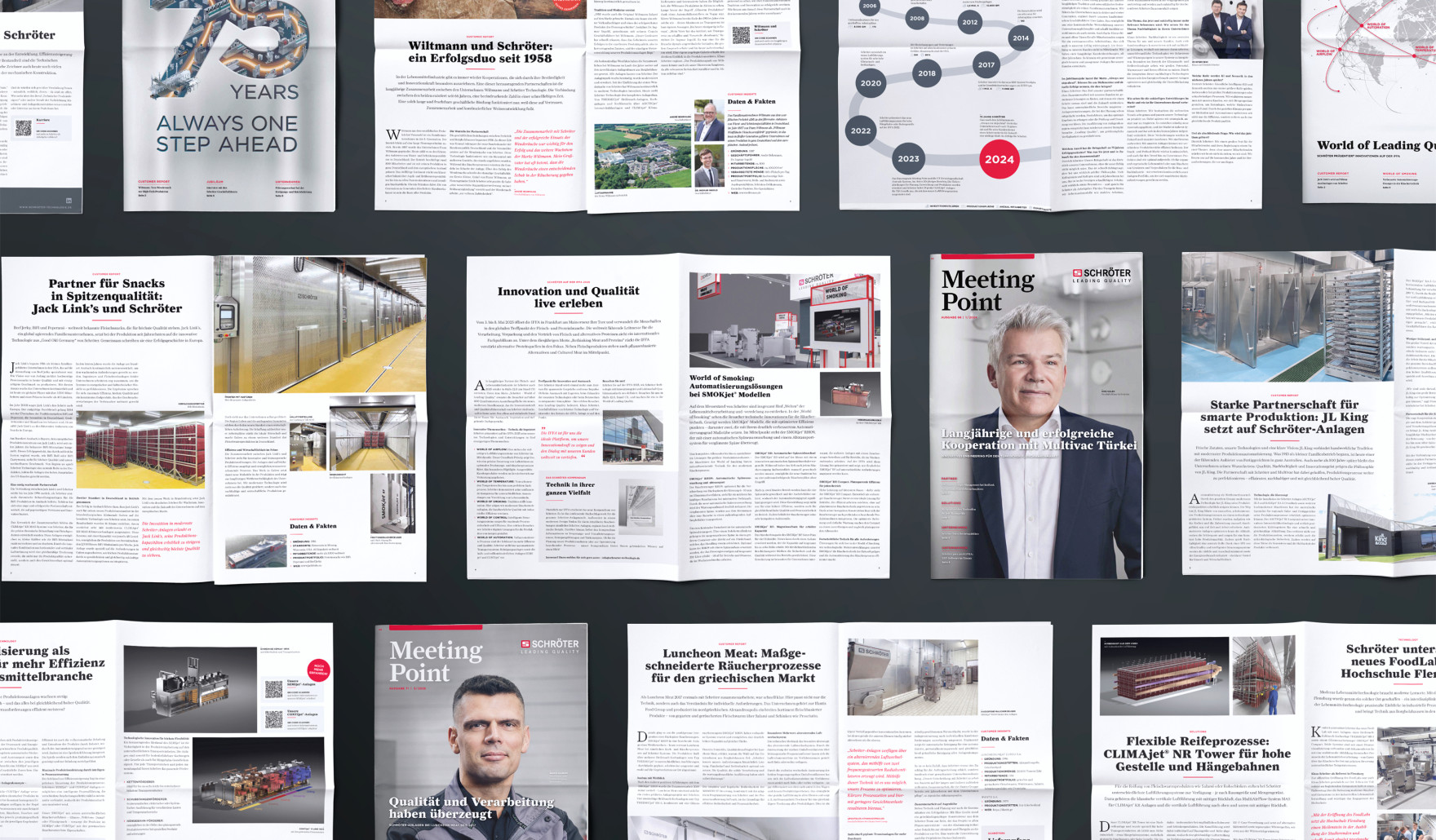 Das Kundenmagazin Meetingpoint von Schröter informiert seit vielen Jahren über Projekte, Technologien und Innovationen rund um thermische Verfahrenstechnik. Um dem etablierten Format neue Impulse zu geben, wurde frischer Wind für Konzept und Inhalte gesucht – besonders im Bereich Text. Neben einer modernen Tonalität sollten auch die Prozesse rund um Redaktion, Produktion und Distribution effizienter werden.